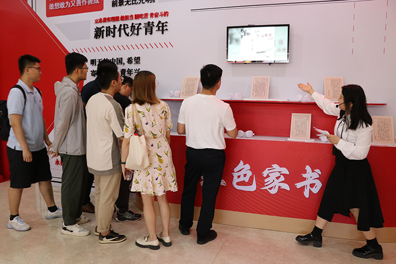 “紅色家書”互動(dòng)墻前,一封封“紅色家書”通過數(shù)字智能互動(dòng)技術(shù)播放,團(tuán)員青年們駐足閱讀,認(rèn)真聆聽,追憶革命先輩家國(guó)情懷,體悟感受信仰力量。