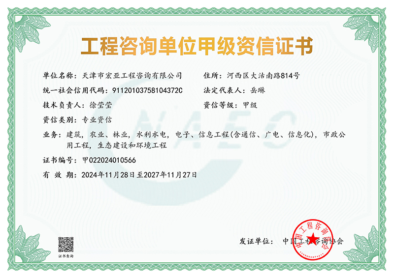 根據(jù)中國工程咨詢協(xié)會2024年第17號公告,天津咨詢所屬宏亞咨詢公司成功獲得建筑,農(nóng)業(yè)、林業(yè),水利水電,電子、信息工程(含通信、廣電、信息化),市政公用工程,生態(tài)建設和環(huán)境工程等6個專業(yè)甲級資信,并成功升級為甲級綜合資信。